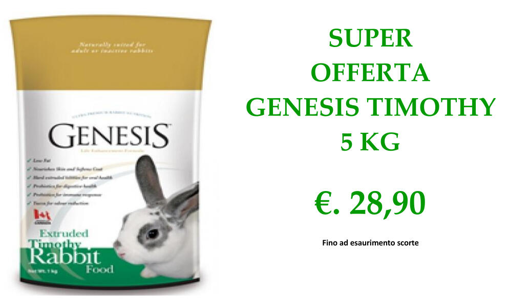 Genesis Rabbit Food è un nuovo prodotto con una visione diversa dell’alimentazione e cura del vostro coniglio, è’ una dieta vegetariana scientificamente formulata per aiutarlo a trascorrere una vita lunga, sana e promuovere la crescita di un mantello sano e lucente.